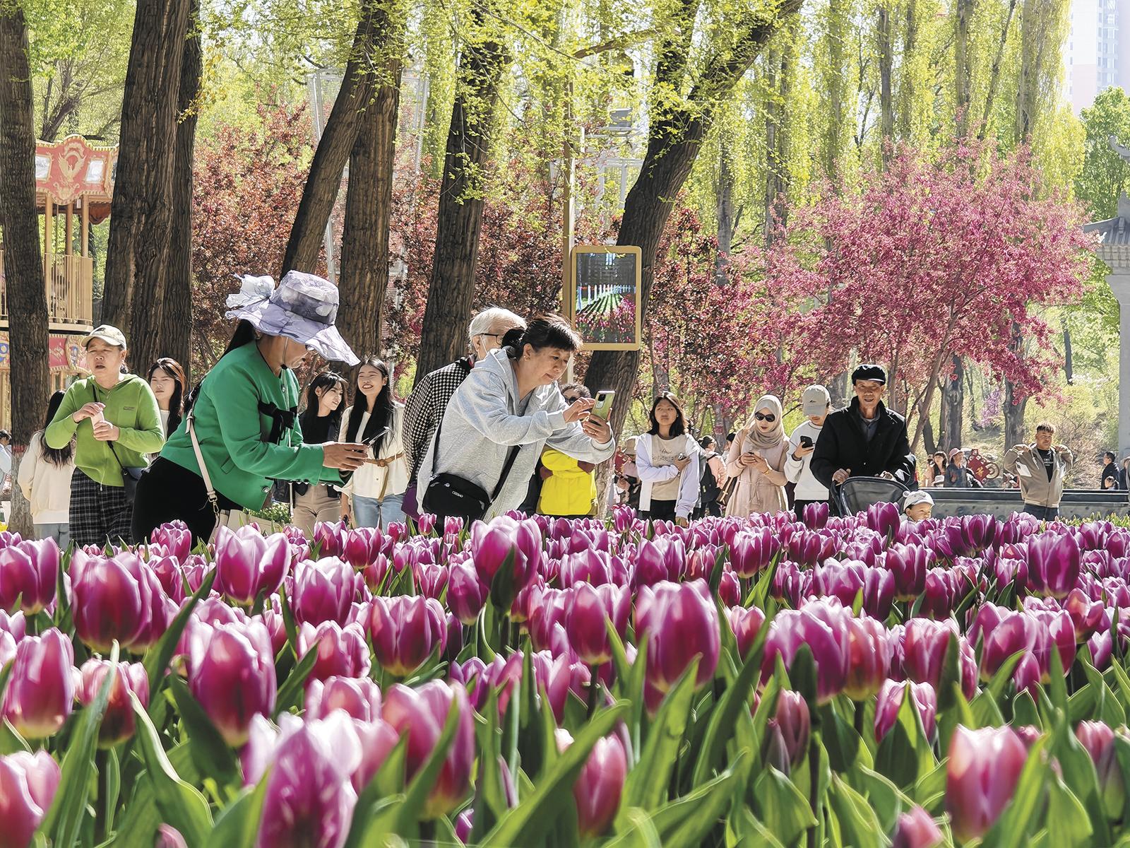 4月25日,西宁市人民公园游人如织,春日赏花氛围浓厚。园内30个品种、22万株郁金香竞相开放,吸引不少市民游客前来观景拍照。公园垂柳泛绿、桃花吐艳,各类春花相映成趣,勾勒出高原春日靓丽图景。