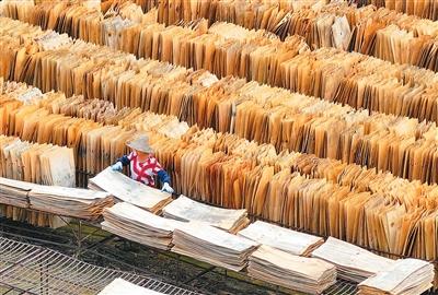 4月27日,在江西省吉安市泰和县塘洲镇东湖村板材加工厂,工人正晾晒板材。