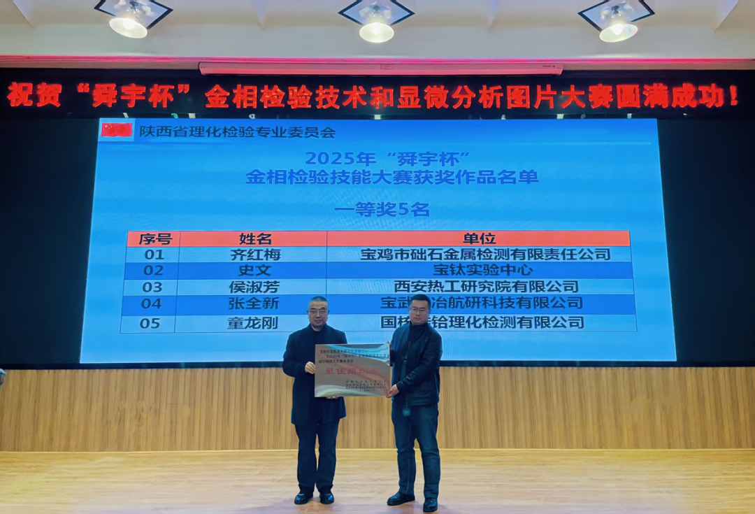 近日,由陕西省机械工程学会、中西部地区理化检验联合会、陕西省机械工程学会理化检验专业委员会联合主办的“舜宇杯”金相检验技术与显微分析图片大赛在西安举行。宝钛集团实验中心一举斩获12项荣誉,其中史文、刘文峰、蔡美超凭借精湛的金相检验技术与高水准的参赛作品分别摘得一、二、三等奖,实验中心以高效的组织协调、严格的作品审查荣获“最佳组织奖”。