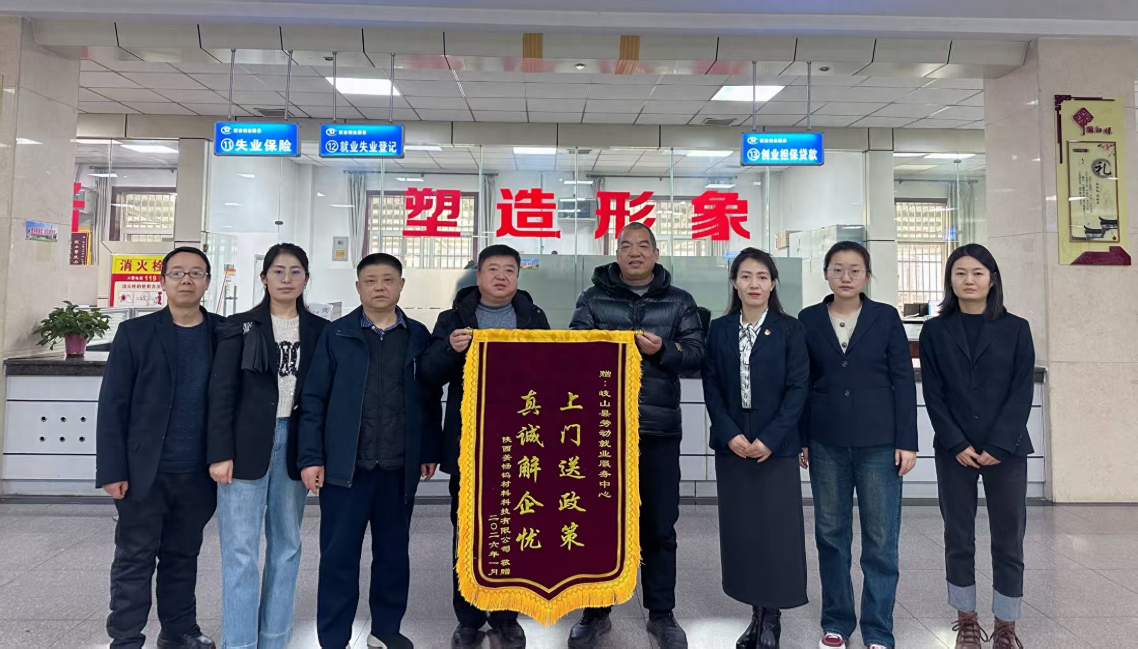 2026年1月,一面绣有“上门送政策 真诚解企忧”的锦旗被赠予岐山县社保中心,饱含服务对象对人社系统稳企纾困政策宣传、惠企利民工作实效的感谢,也彰显了人社系统在民生保障领域的责任担当和服务温度。