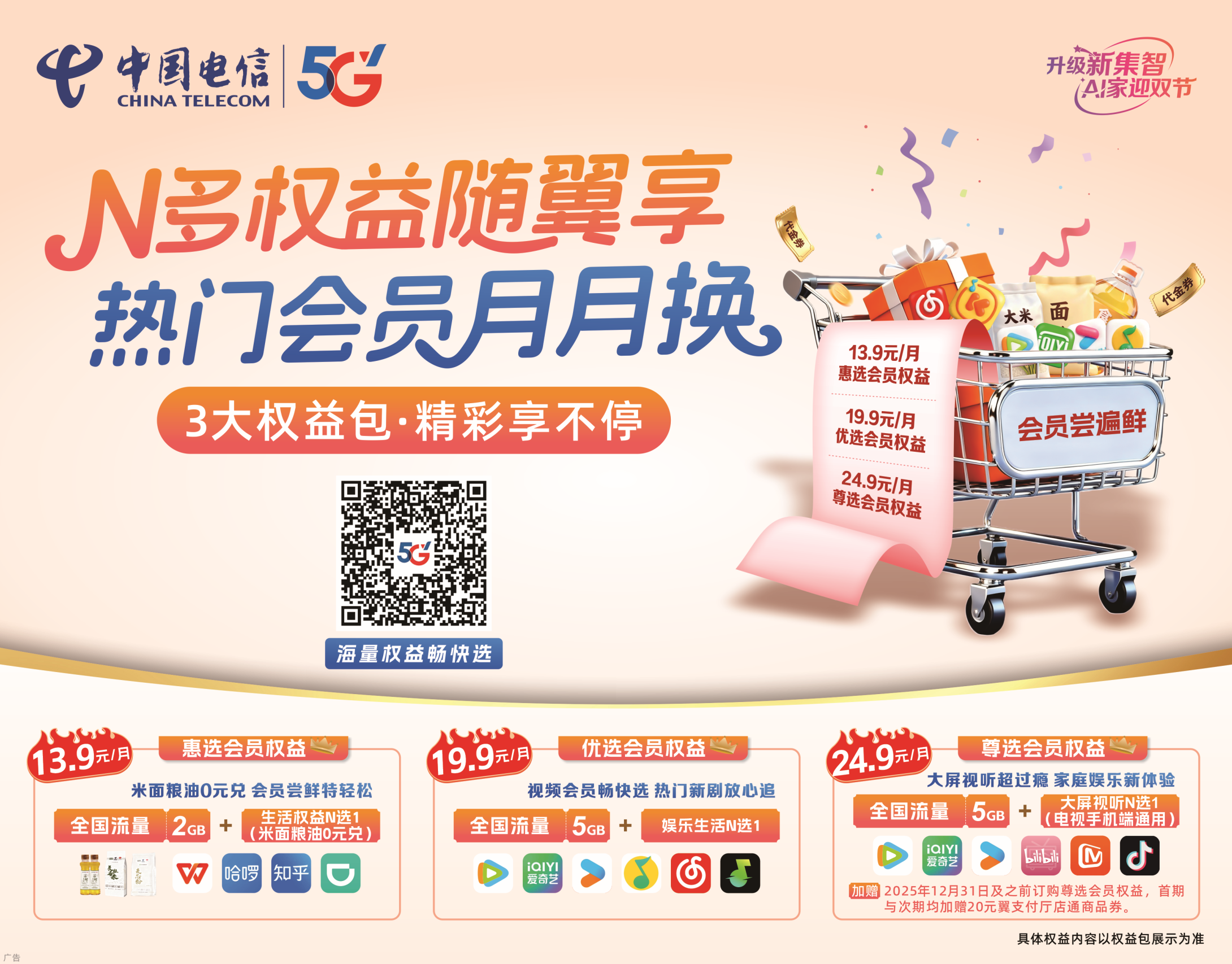 中国电信N多权益随翼享,热门会员月月换。5G权益活动:提供13.9元月、19.9元月、24.9元月三档会员权益包,含全国流量及生活娱乐类权益,每月可按需选择对应权益。