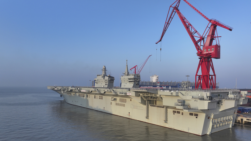 14日9时许,我国076两栖攻击舰首舰四川舰从上海沪东中华造船厂码头解缆启航,赴相关海域开展首次航行试验任务。
