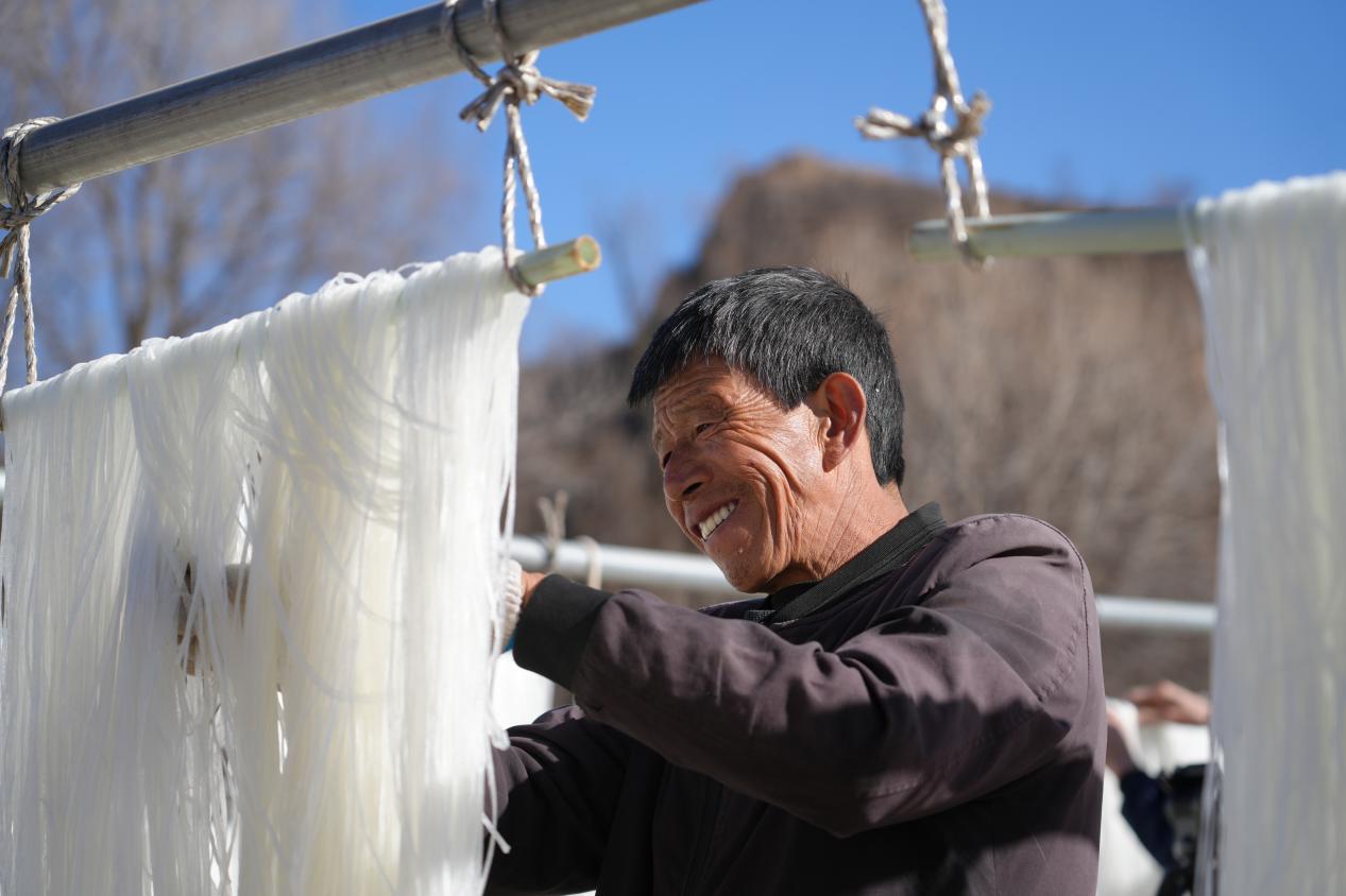 入冬以来,佳县乌镇张家沟村的空气中弥漫着土豆淀粉的清香。晒场上,一排排粉条架如银带垂挂。农户们忙着挂粉、晾晒,洁白的粉条在阳光下泛着光泽,成为村落里最具烟火气的“风景线”。