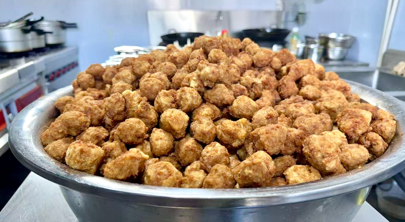 金黄酥脆、外焦里嫩的炸丸子,是神木人春节餐桌上不可或缺的经典美食,小小丸子承载着阖家团圆的美好寓意,一口下去,满是地道的神木年味儿与乡愁记忆。 滨河新区街道一家饭店后厨内热气腾腾,餐饮从业者梁璐正带着师傅们忙碌不停。肥瘦相间的猪肉被细细剁成肉馅,加入鸡蛋和胡椒粉、盐、葱花等调料,再拌入淀粉,顺着一个方向充分搅拌,让肉馅变得筋道十足。