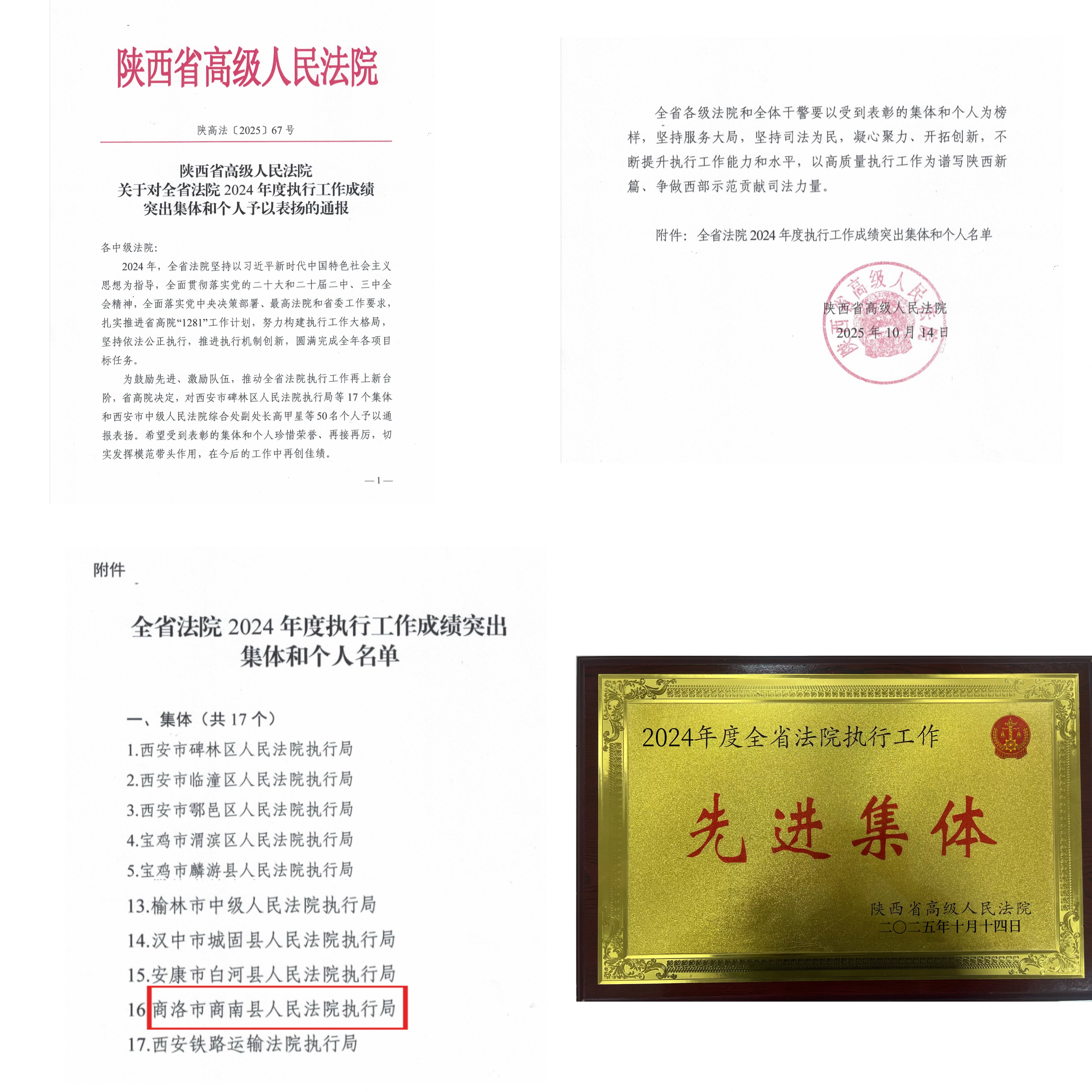 近日,陕西省高级人民法院发布《关于对全省法院2024年度执行工作成绩突出集体和个人予以表扬的通报》,商南县人民法院执行局荣获“全省法院执行工作先进集体”称号。
