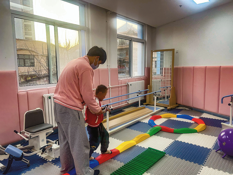 近日,洛南县妇幼保健院儿童康复中心,康复治疗师沈俊龙正在引导4岁的小明(化名)做平衡性训练。
