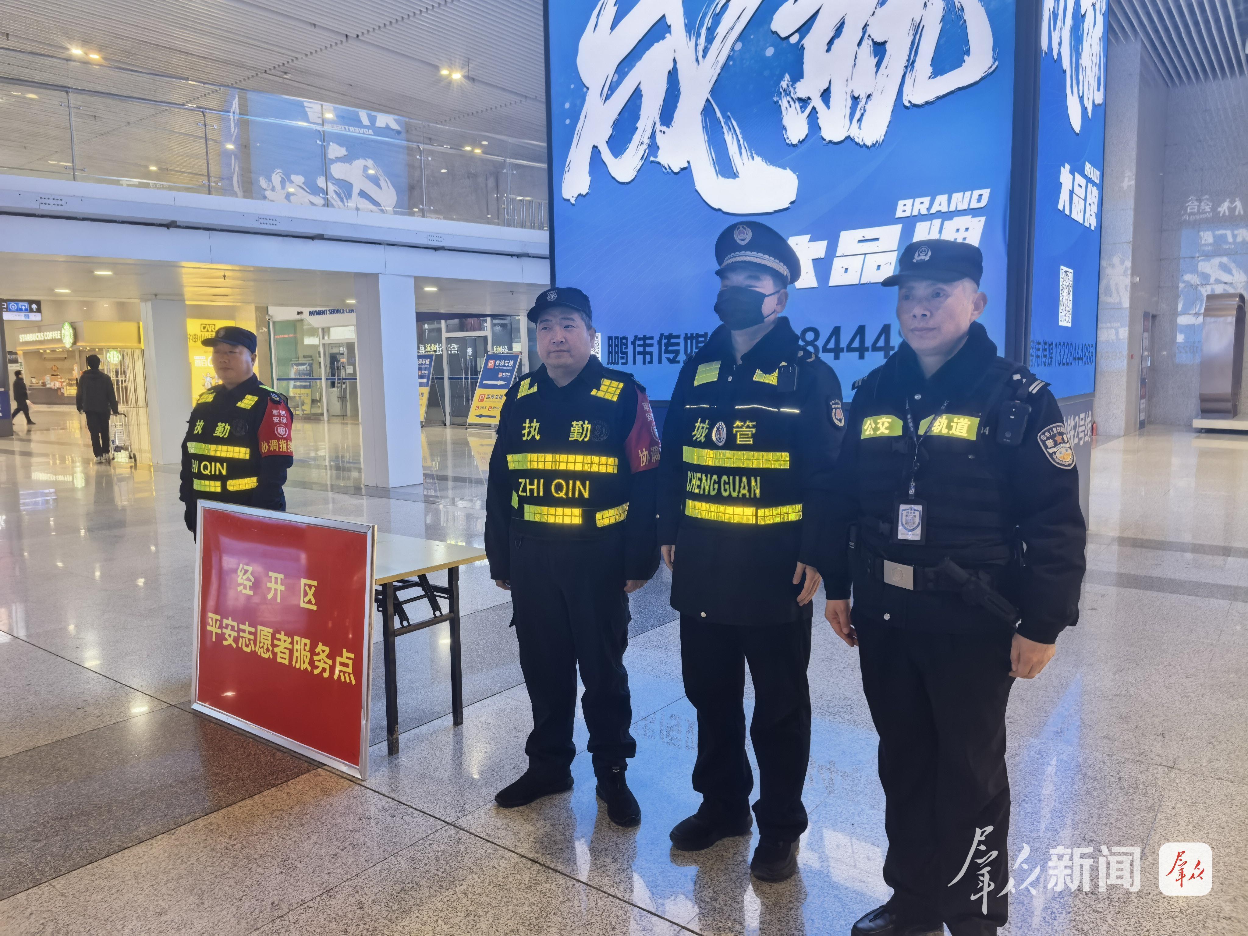 2月16日9时许,除夕的西安北站,年味裹着人流的暖意,南广场进站口的一处执勤点旁,西安市公安局公交轨道公安局十八大队民警王小兵顶着寒风,为来来往往的旅客服务。