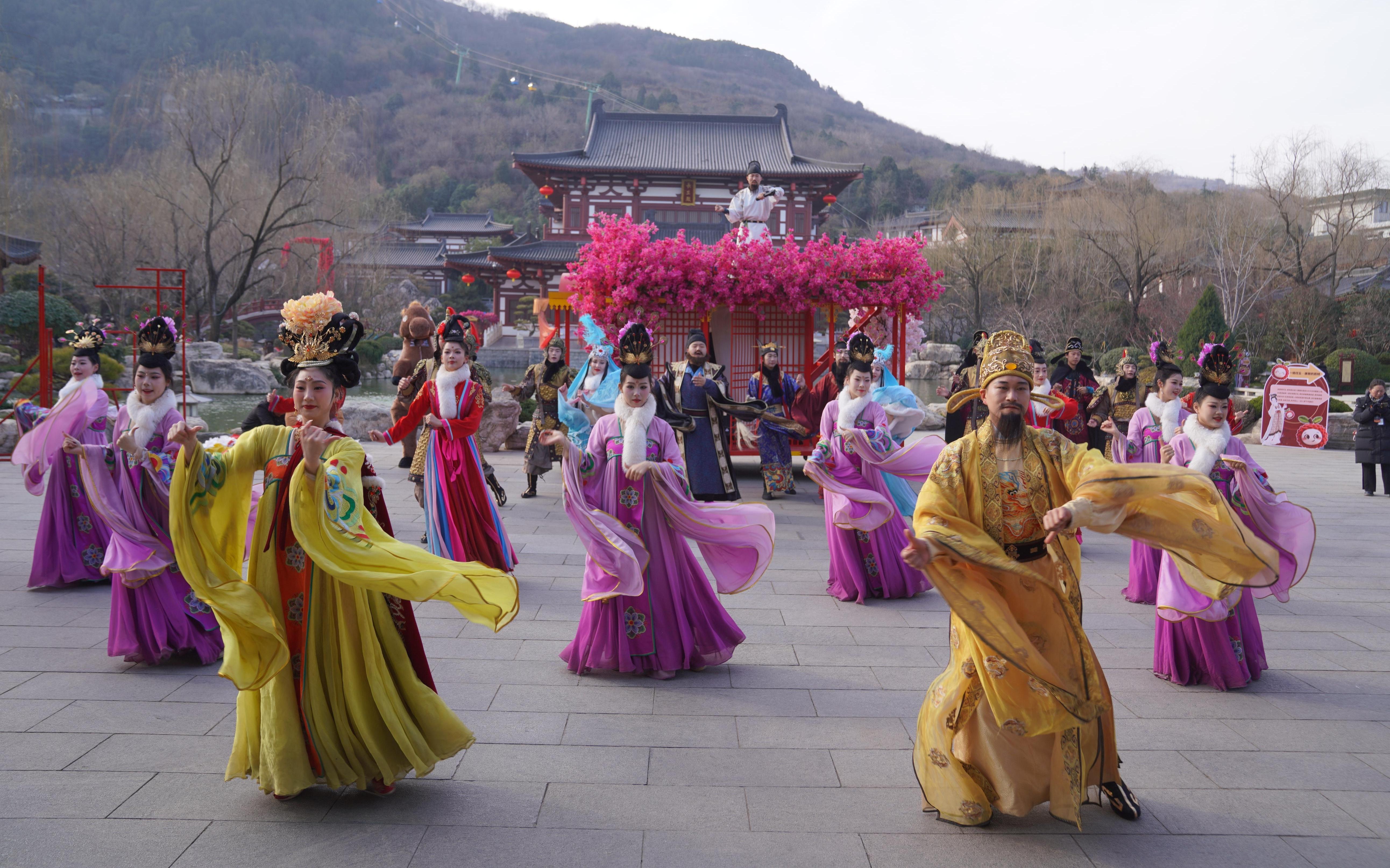钟鼓乐声,宫门渐开,广袖舒展,舞姿翩跹……2月16日上午9时,在位于西安市临潼区的华清宫景区望京门前,气势恢宏的大唐迎宾礼拉开了当天盛唐国潮主题演艺活动的序幕。