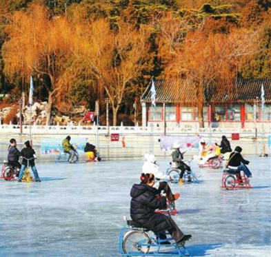 北京市北海公园荷花湖5000余平方米的天然冰场日前开门迎客,吸引众多市民游客到此休闲游玩。