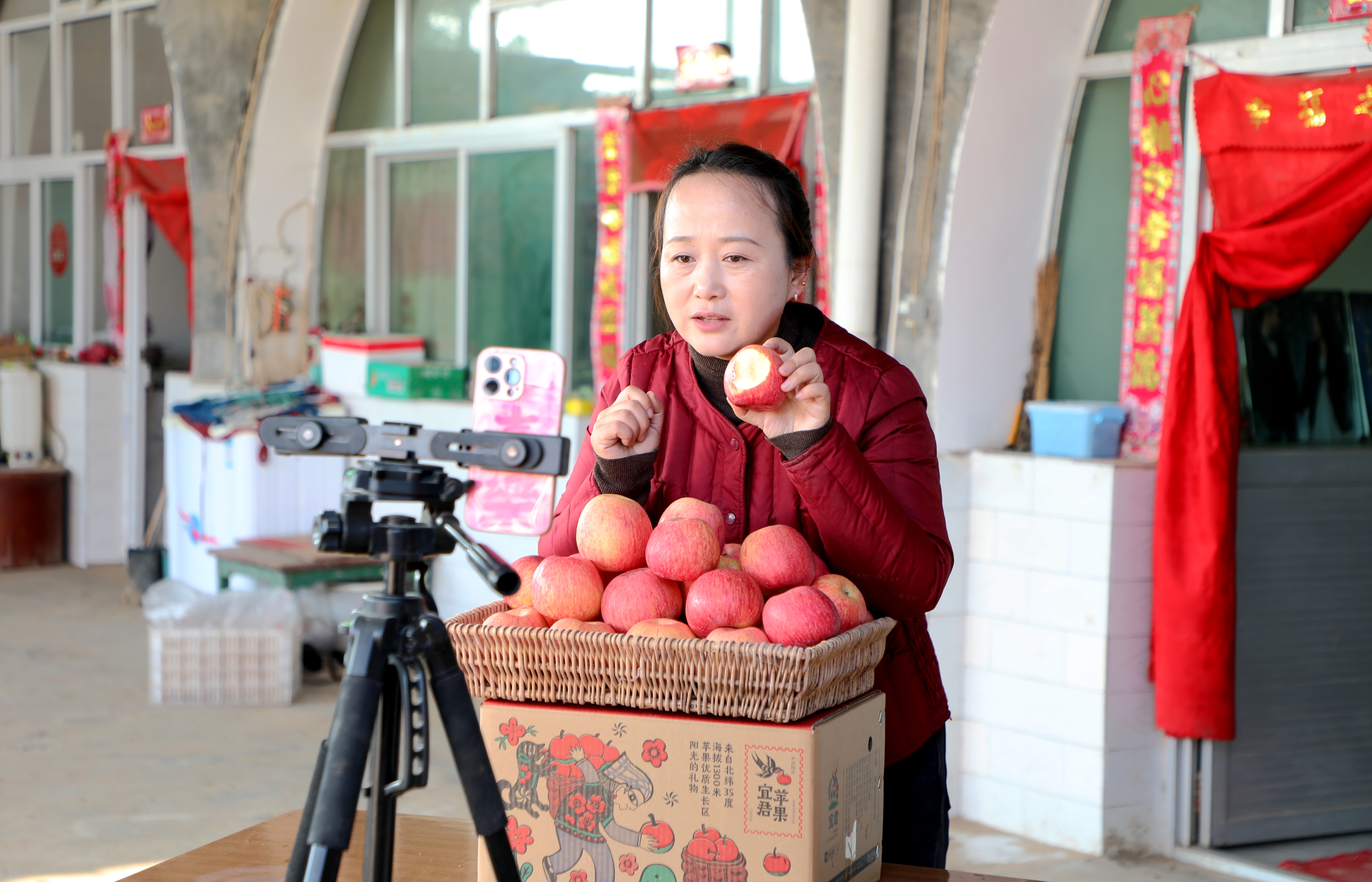 “哈喽,宝宝们,欢迎家人们来到直播间!快看,我们宜君苹果咬一口,脆甜多汁,瞧瞧这色泽,是原产地土生土长的味道。”36岁的问艳丽身穿红色棉袄,站在宜君县尧生镇孟皇村自家院子的三孔窑洞前,面对直播镜头侃侃而谈。